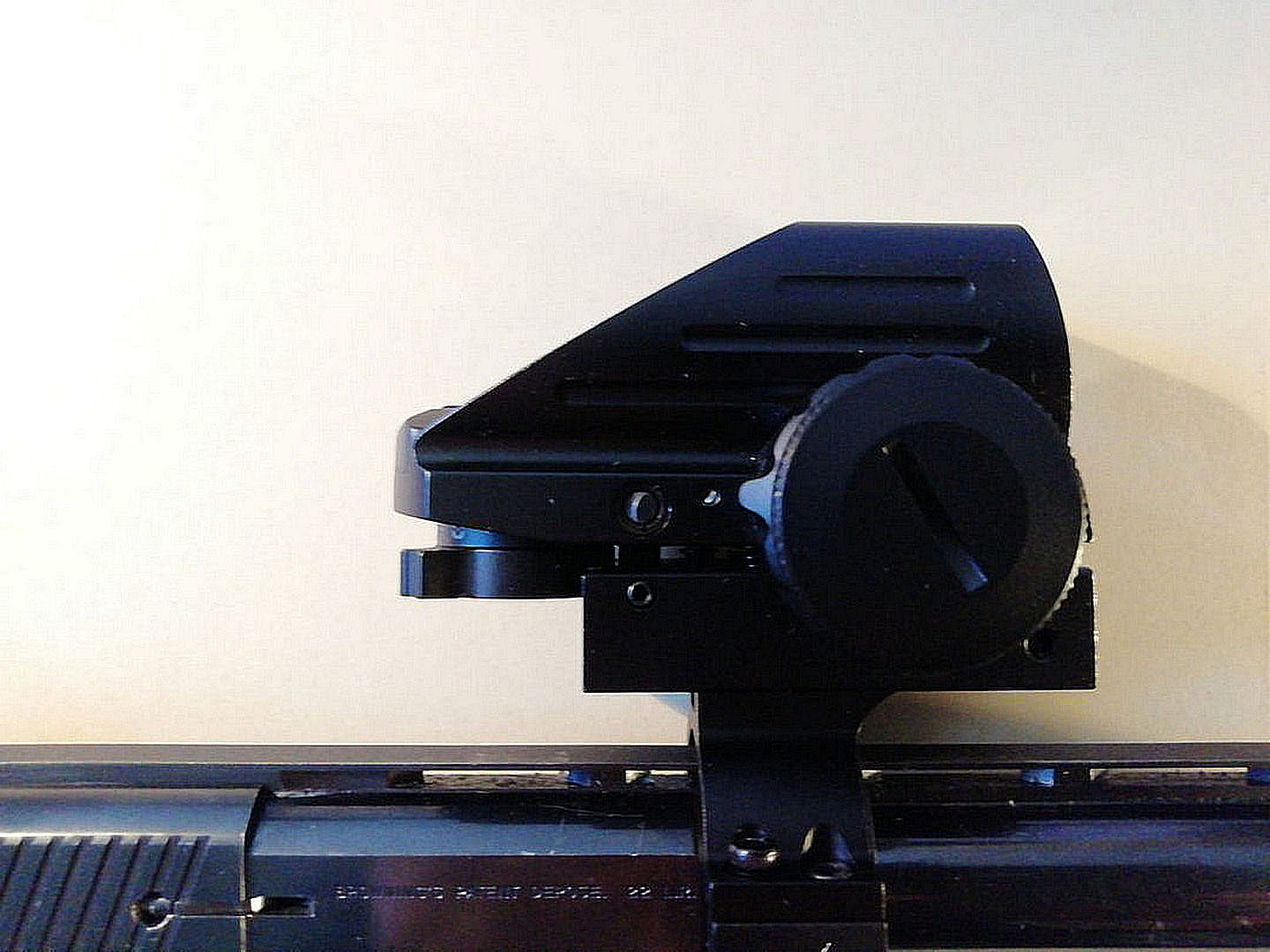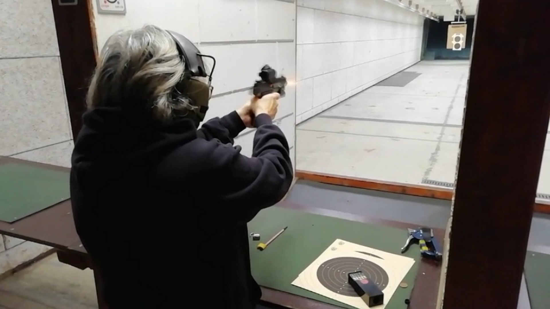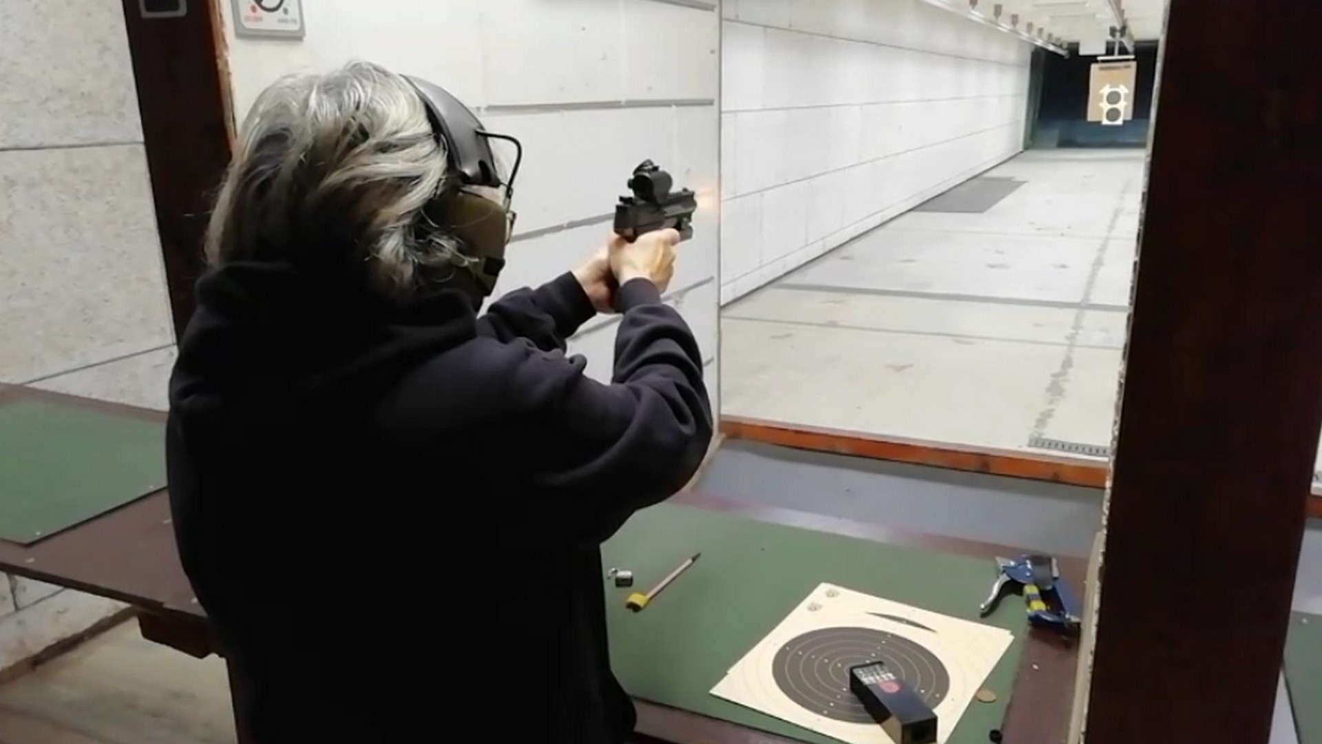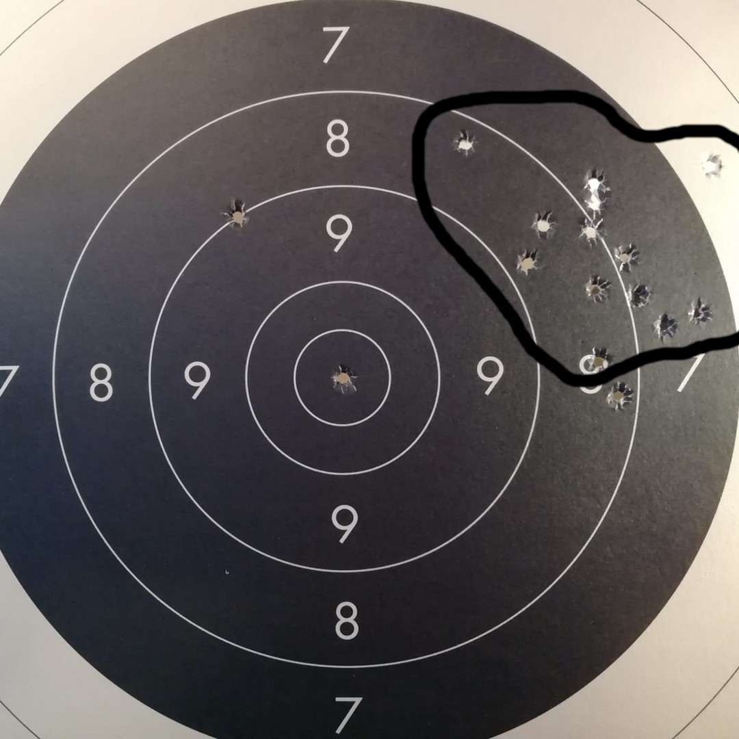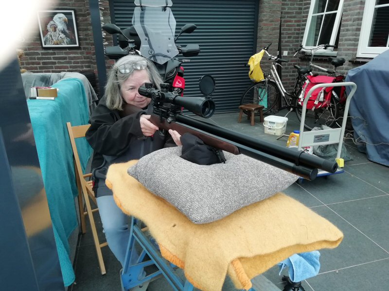 Er werd door een collega schutter gevraagd om zijn pistool met red-dot kijker in te schieten. Aangezien Toos een vast hand heeft en we niet wisten hoe gevoelig de afstelling was, heeft het een tijdje geduurd en menige kogels. 😀