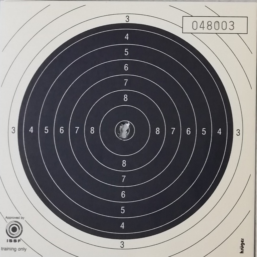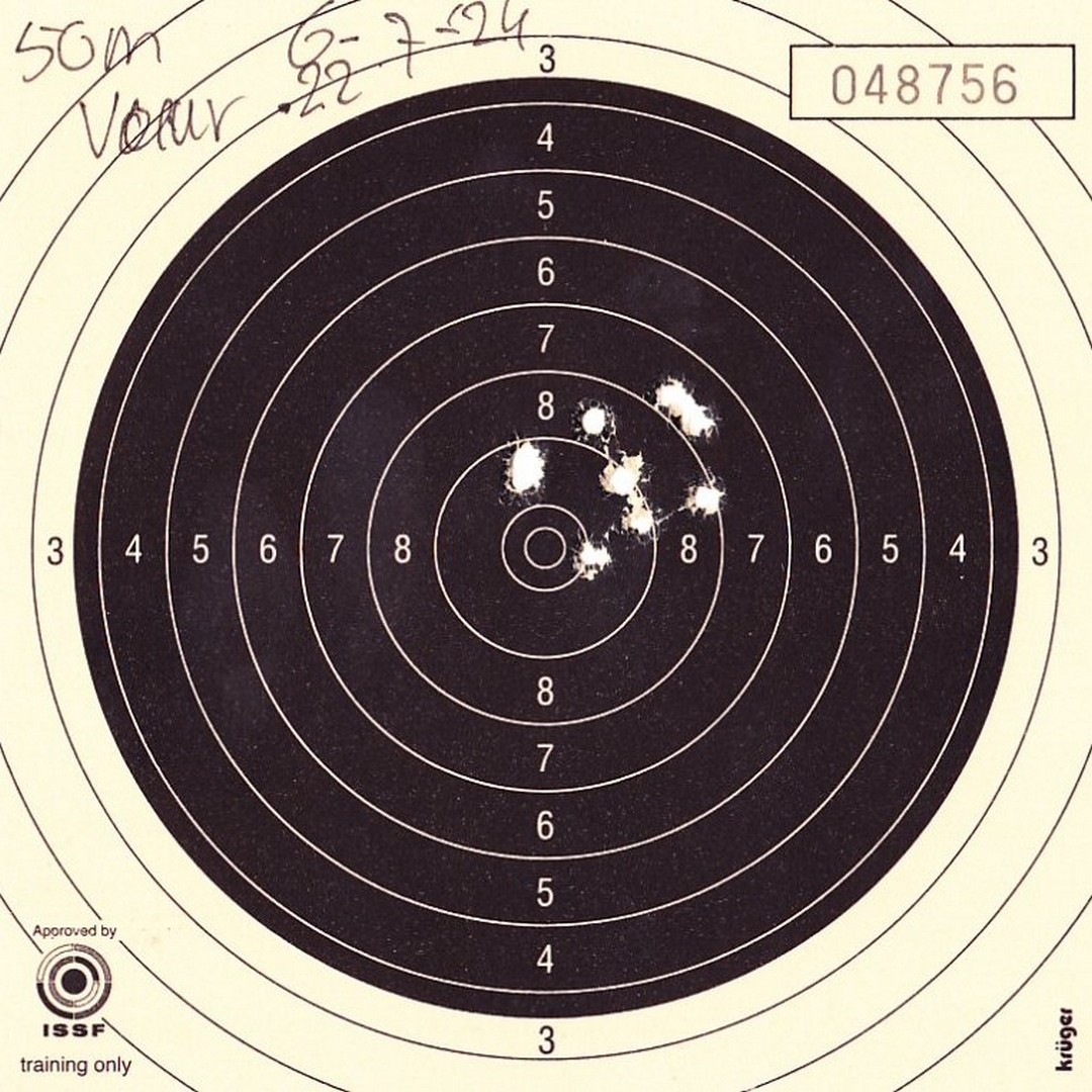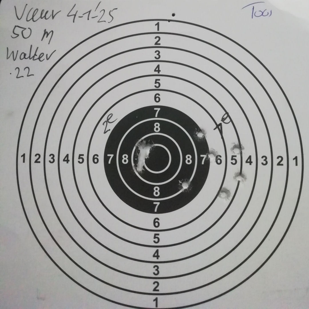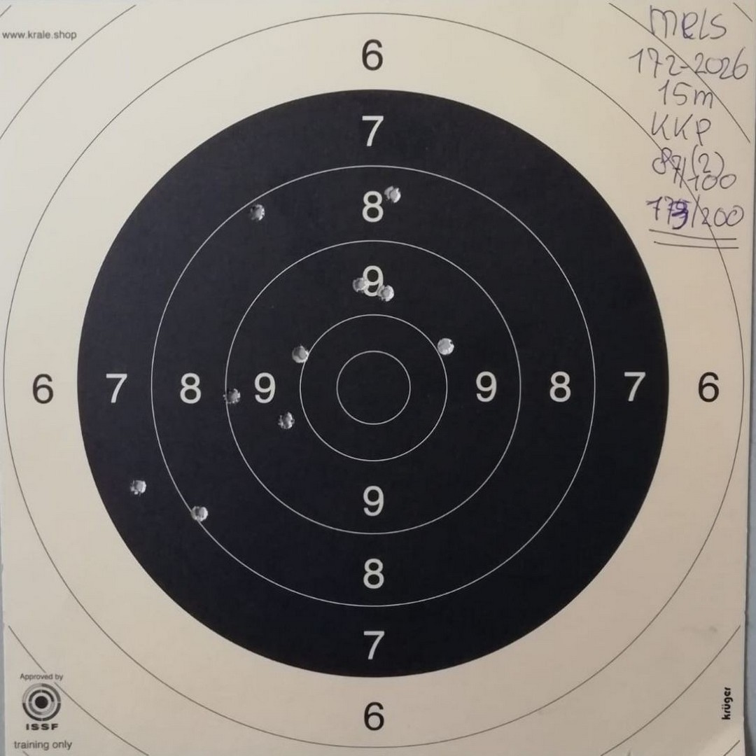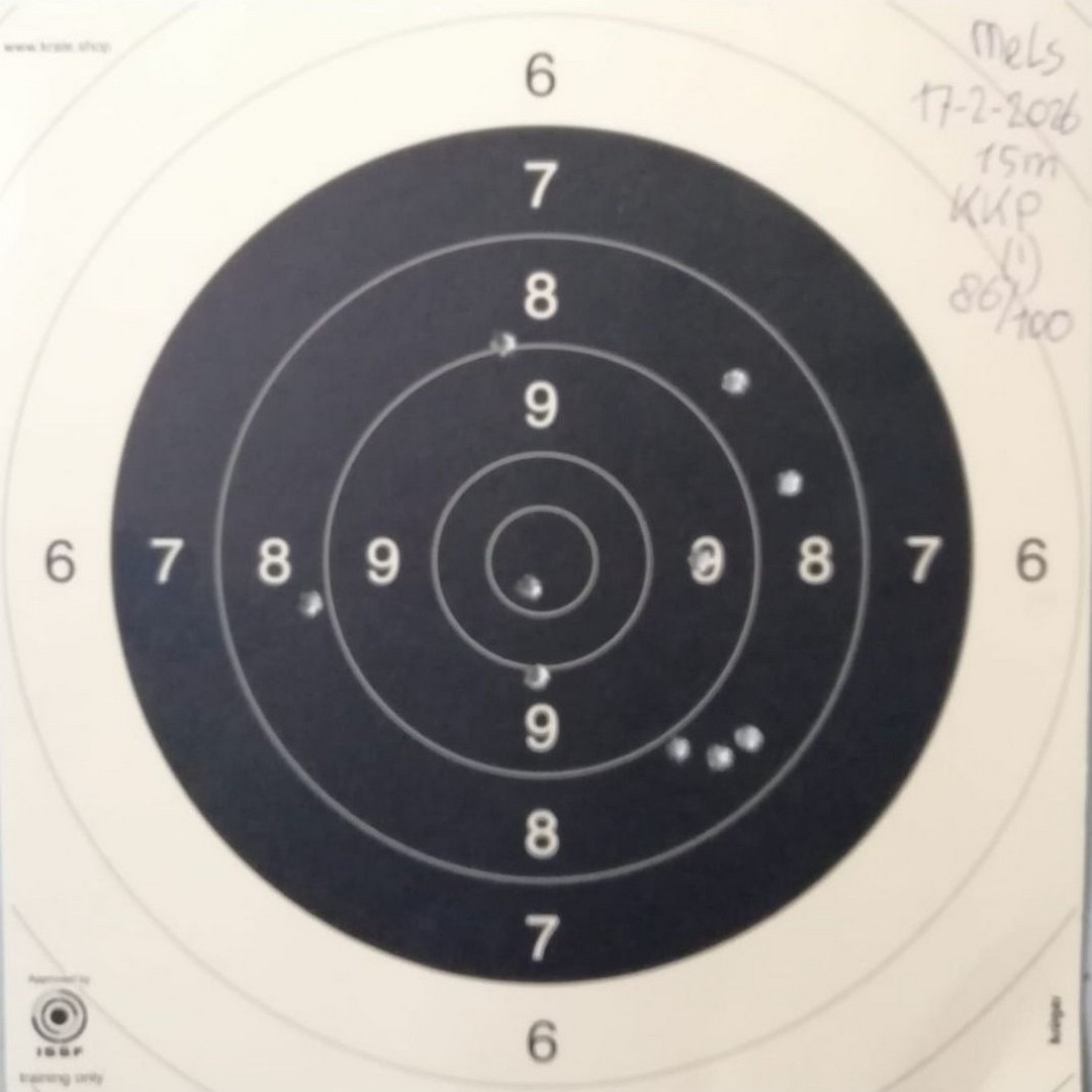 Mels heeft geschoten met een "wedstrijd" Walther GSP .22LR pistool op 10 m. De 4 aan de linkerkant waren "proef" schoten. Men dacht dat de Keep-Korrel vizier niet goed stond en daardoor werd er aan de linker kant geschoten. Echter deze stond wel goed, het resultaat was geweldig 59/60 punten.