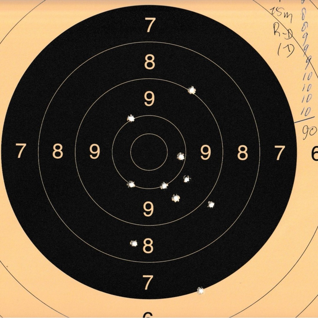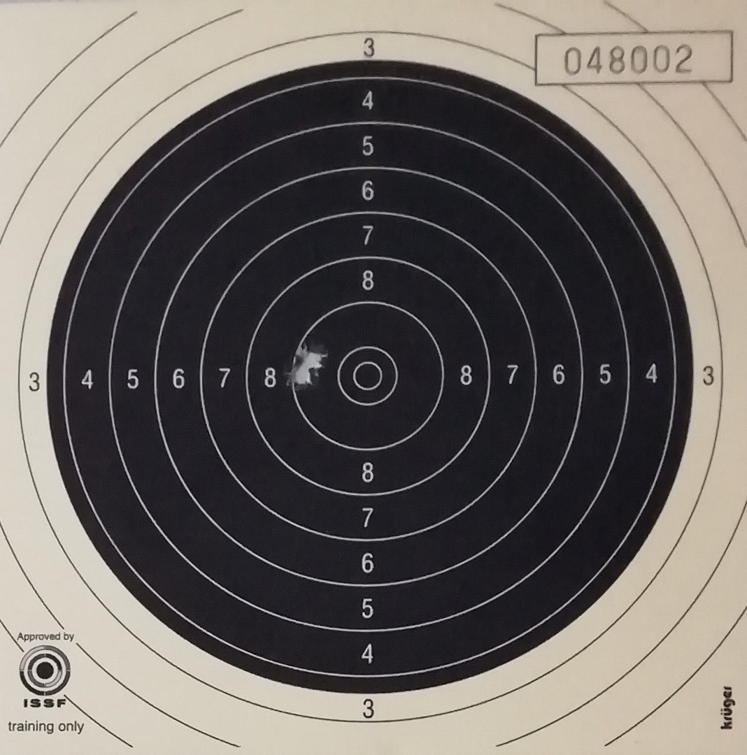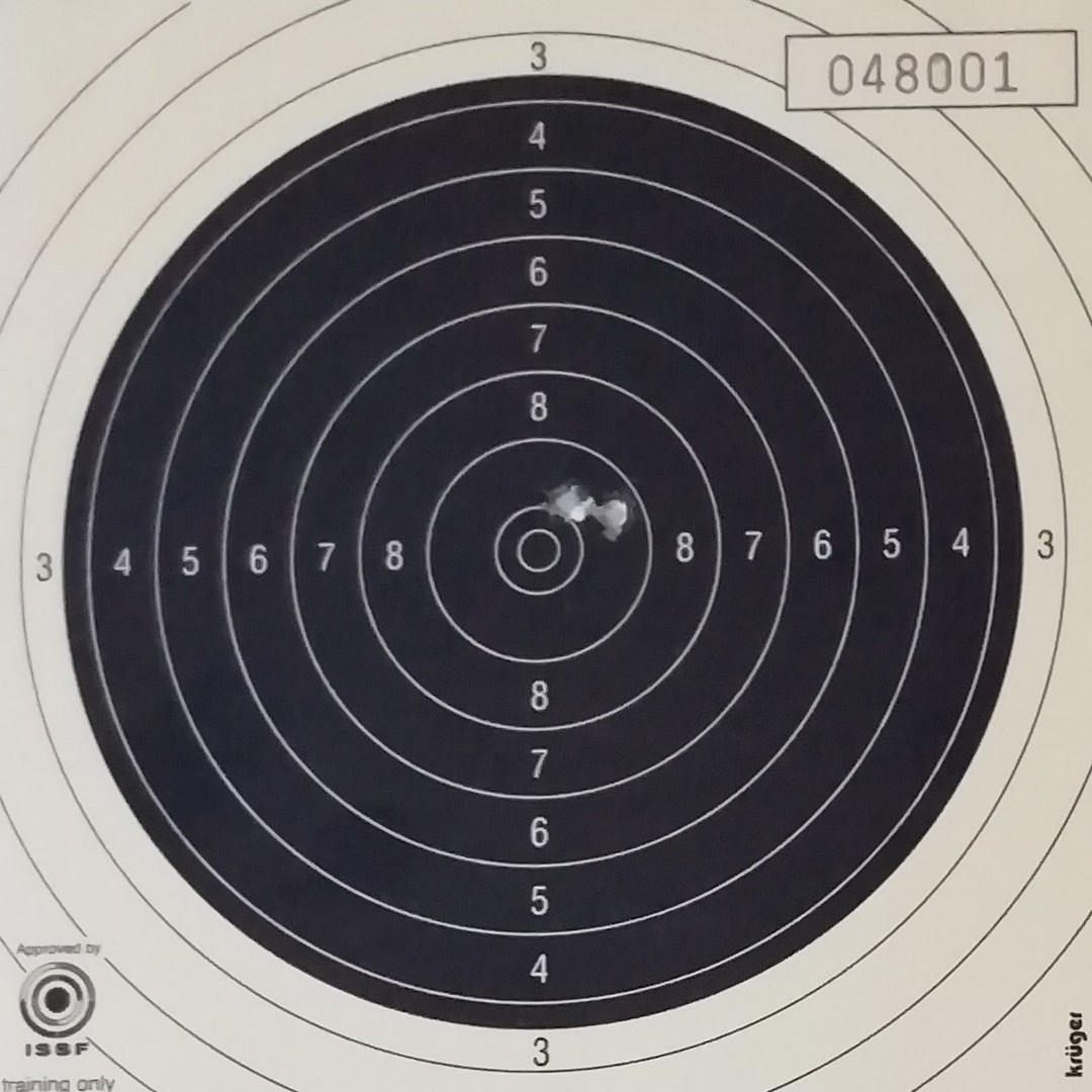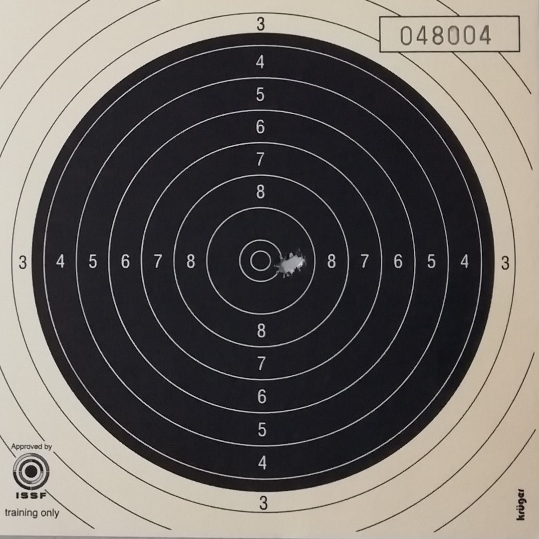 Mels heeft geschoten met een "wedstrijd" Walther GSP .22LR pistool op 10 m. De 4 aan de linkerkant waren "proef" schoten. Men dacht dat de Keep-Korrel vizier niet goed stond en daardoor werd er aan de linker kant geschoten. Echter deze stond wel goed, het resultaat was geweldig 59/60 punten.