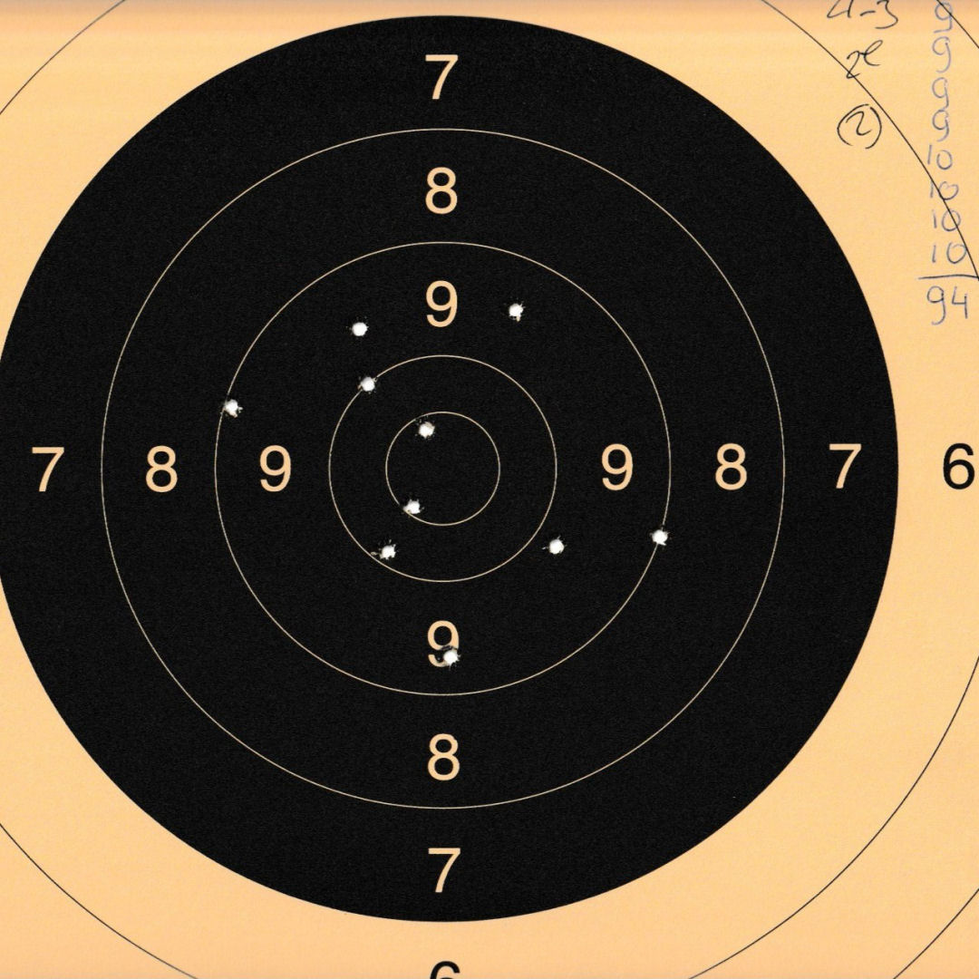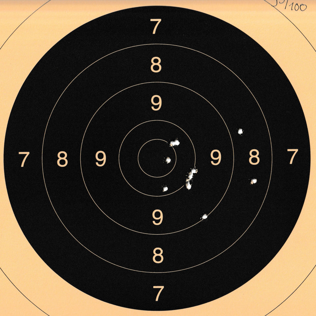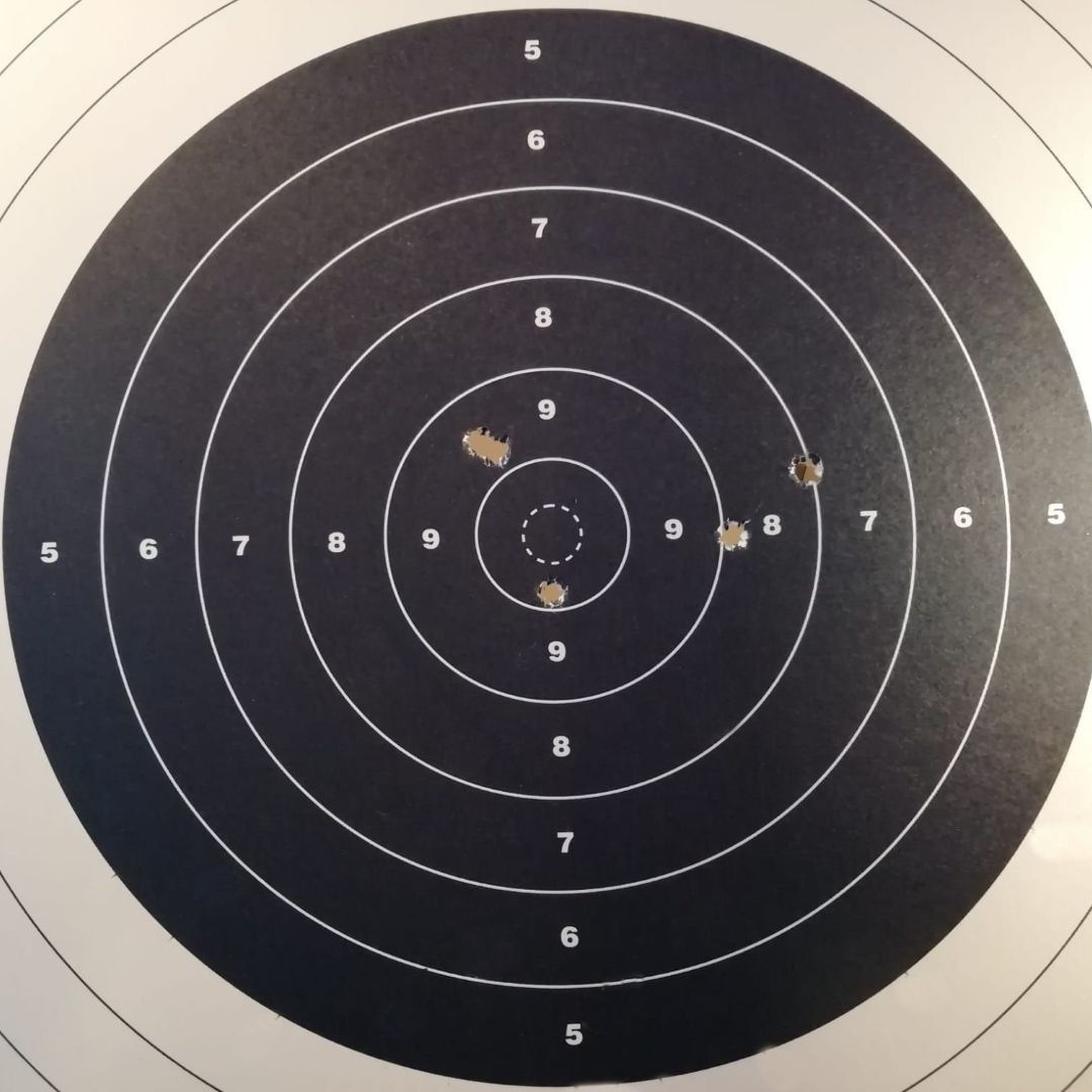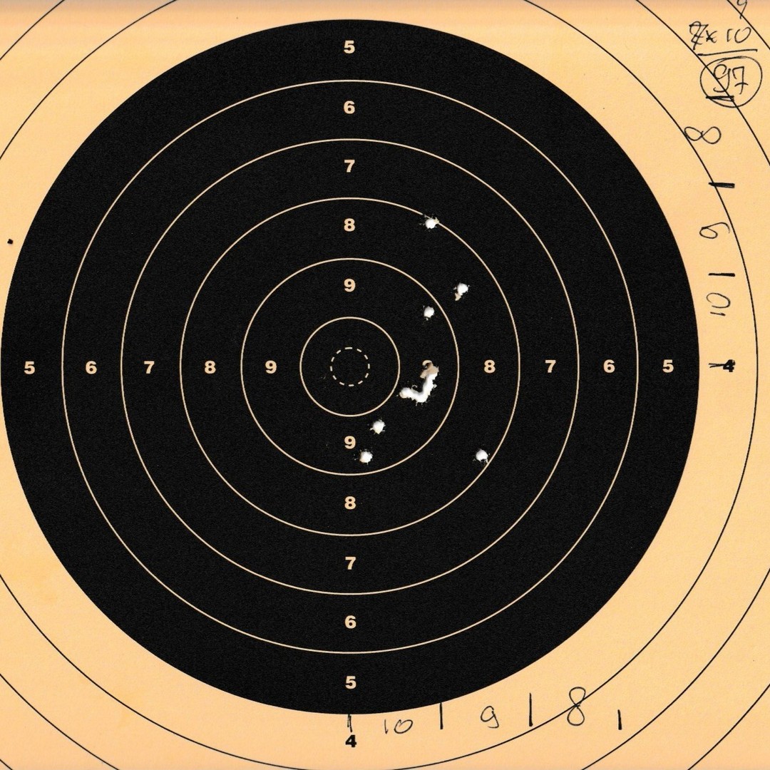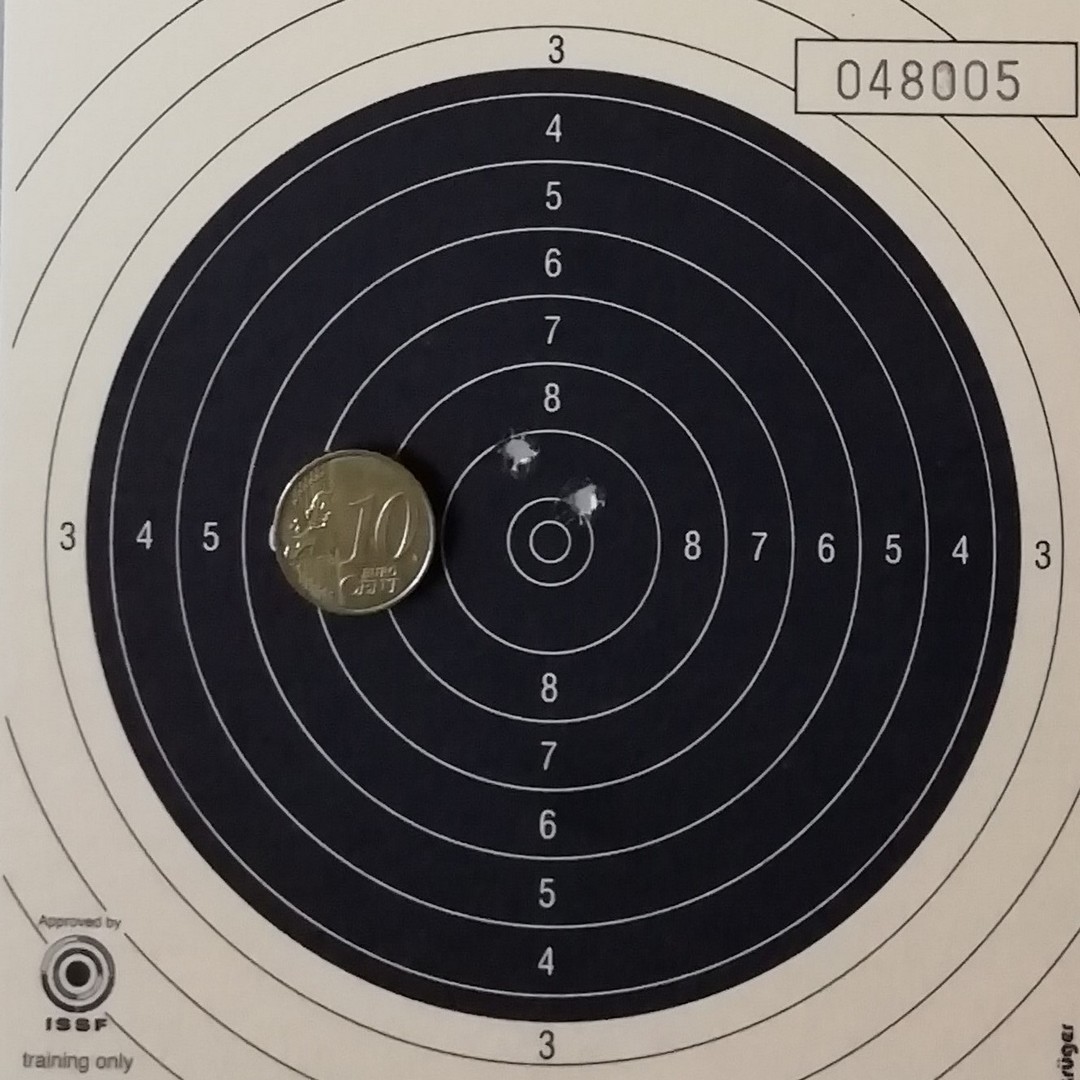 Mels heeft geschoten met een "wedstrijd" Walther GSP .22LR pistool op 10 m. De 4 aan de linkerkant waren "proef" schoten. Men dacht dat de Keep-Korrel vizier niet goed stond en daardoor werd er aan de linker kant geschoten. Echter deze stond wel goed, het resultaat was geweldig 59/60 punten.