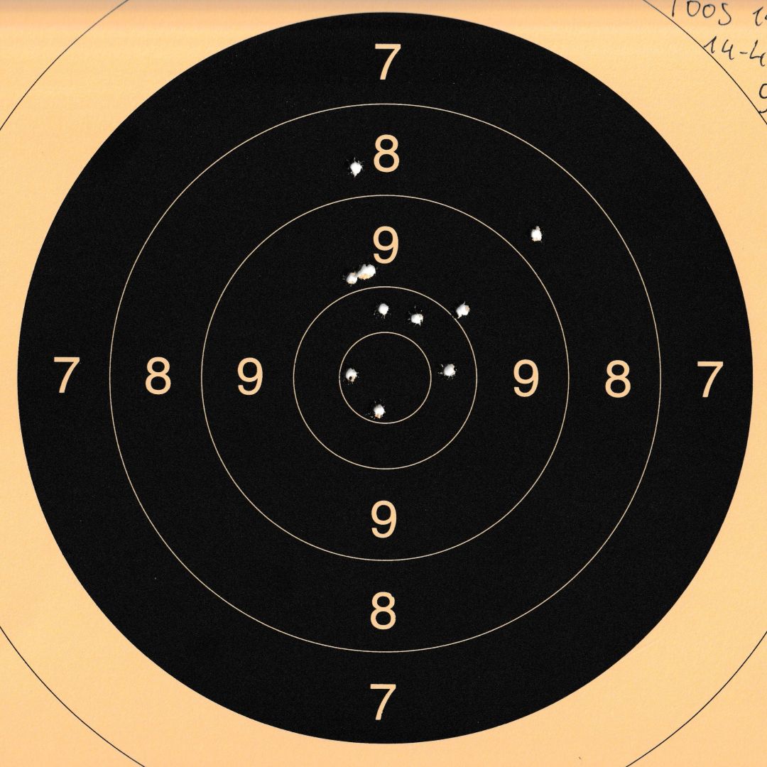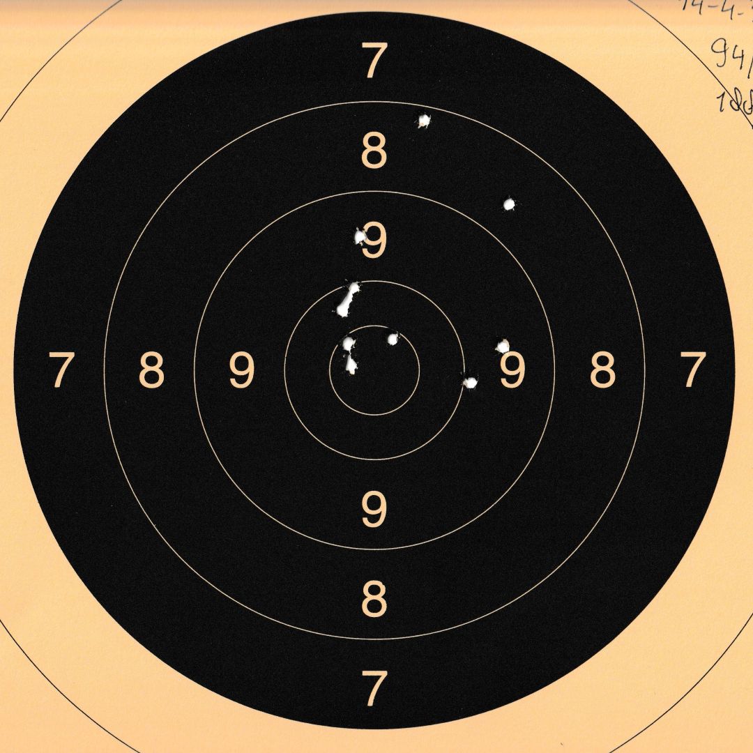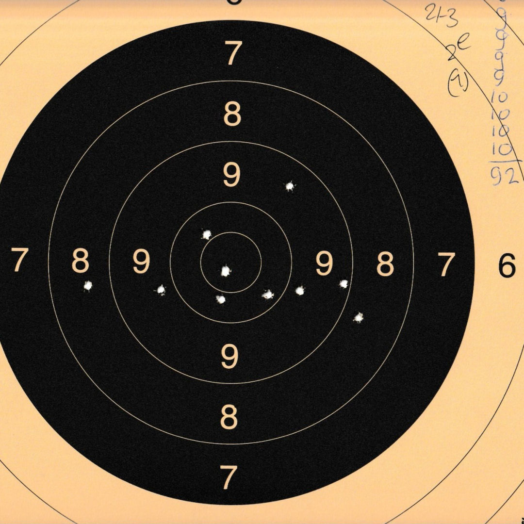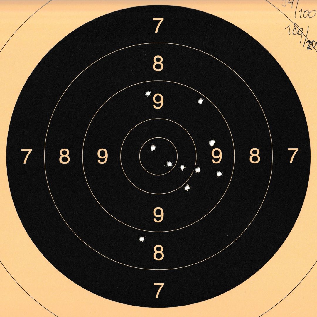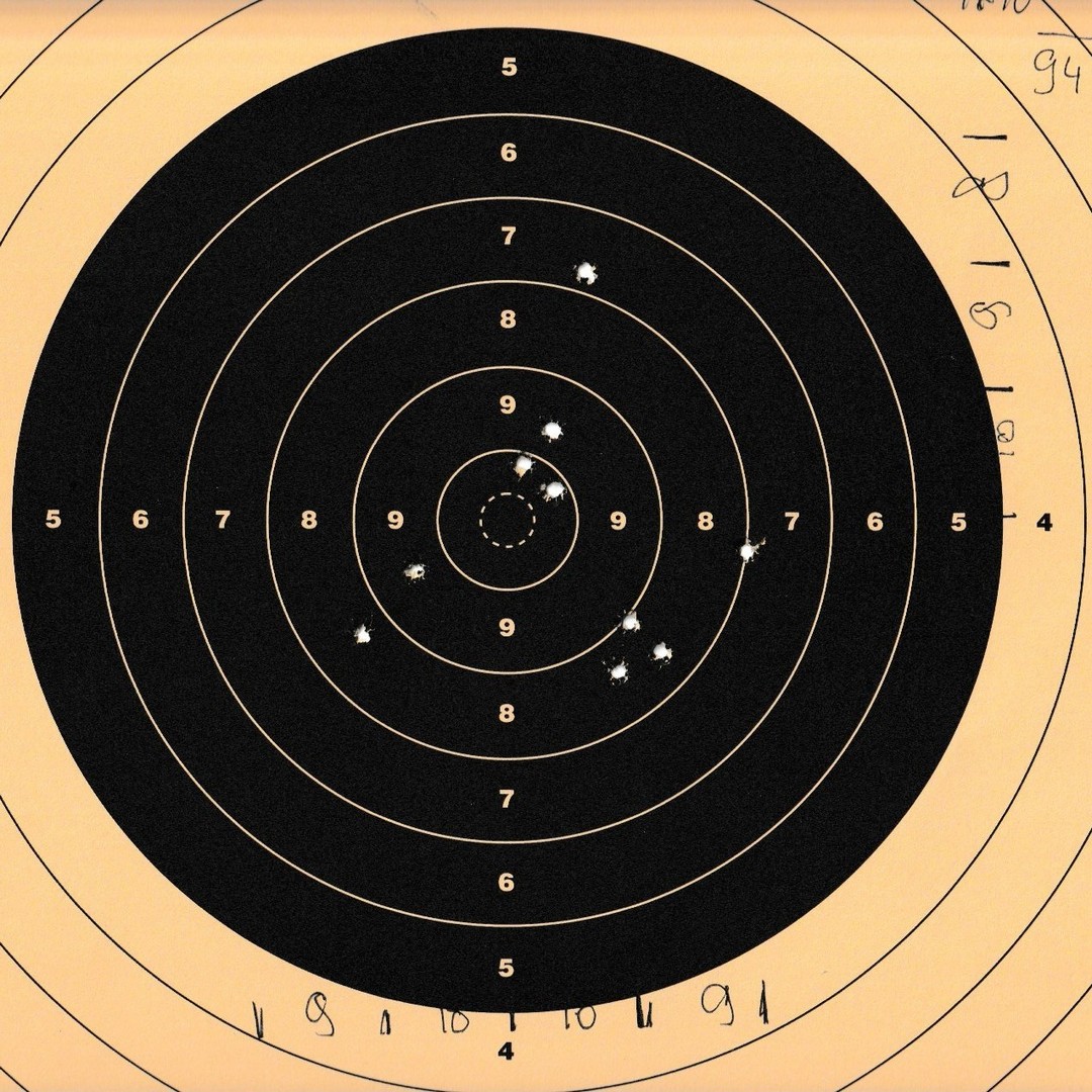 Mels heeft geschoten met een "wedstrijd" Walther GSP .22LR pistool op 10 m. De 4 aan de linkerkant waren "proef" schoten. Men dacht dat de Keep-Korrel vizier niet goed stond en daardoor werd er aan de linker kant geschoten. Echter deze stond wel goed, het resultaat was geweldig 59/60 punten.