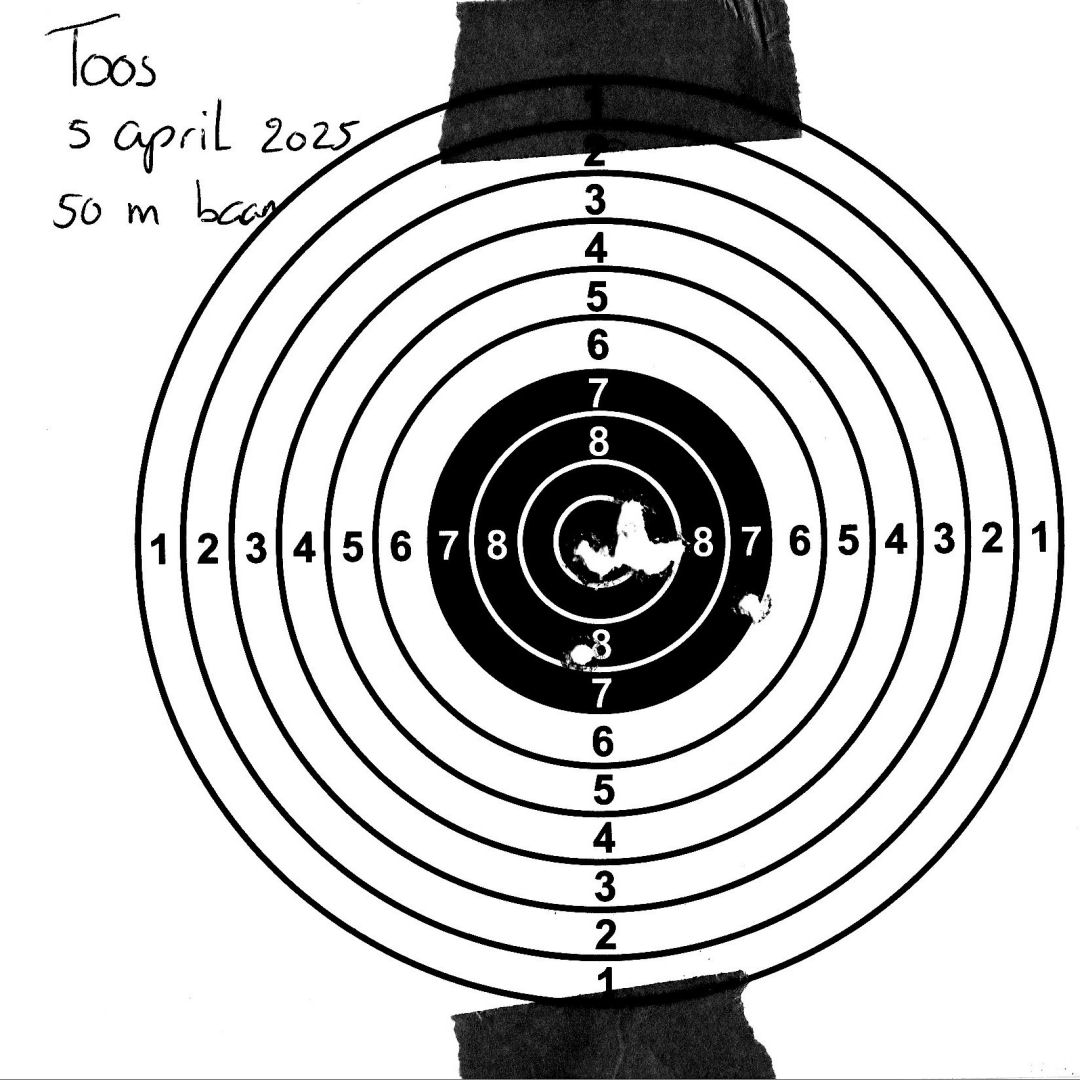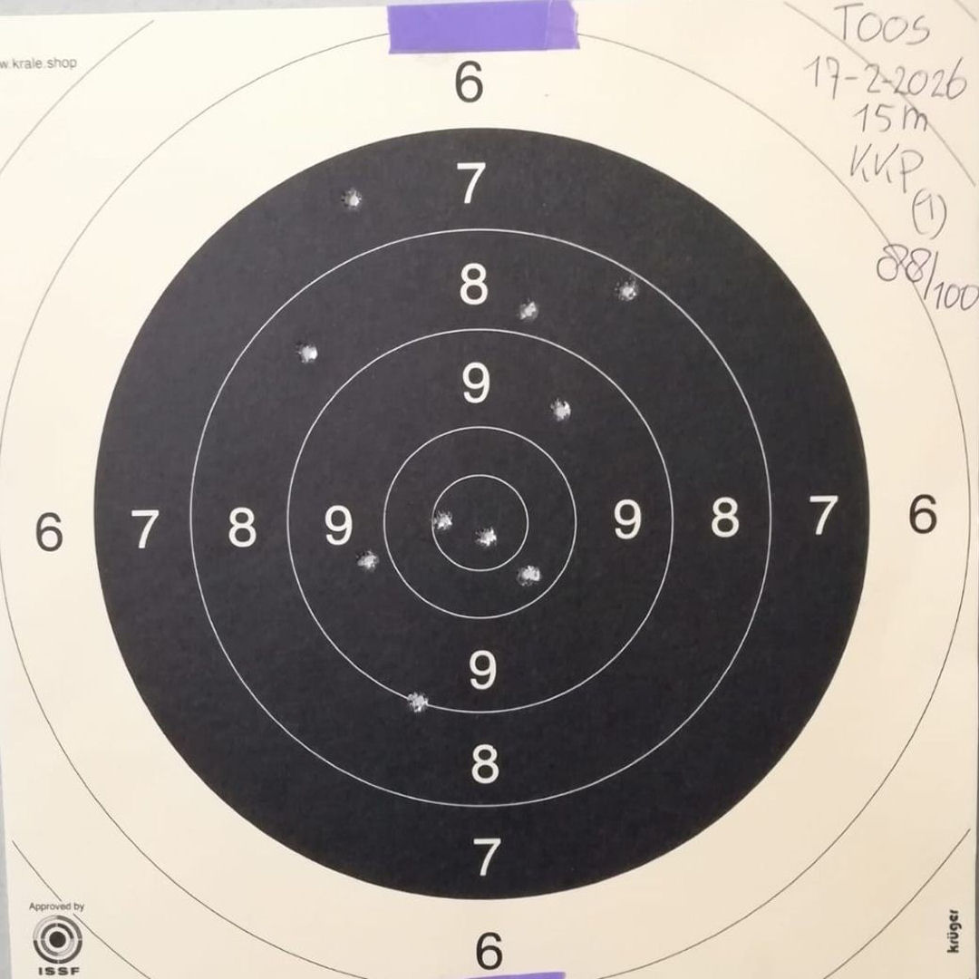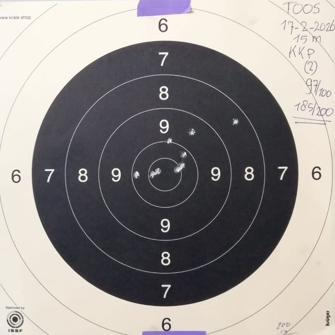 Mels (geschoten op 19 Mrt. 2026) en Toos (op 21 Mrt. 2026) hebben hun 2de pistool wedstrijd geschoten, staand op 15m. Dit keer beide met Mels zijn eigen Browning Buck Mark Rosewood .22LR